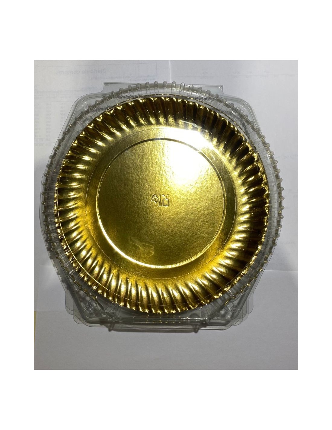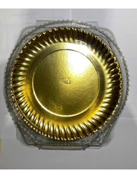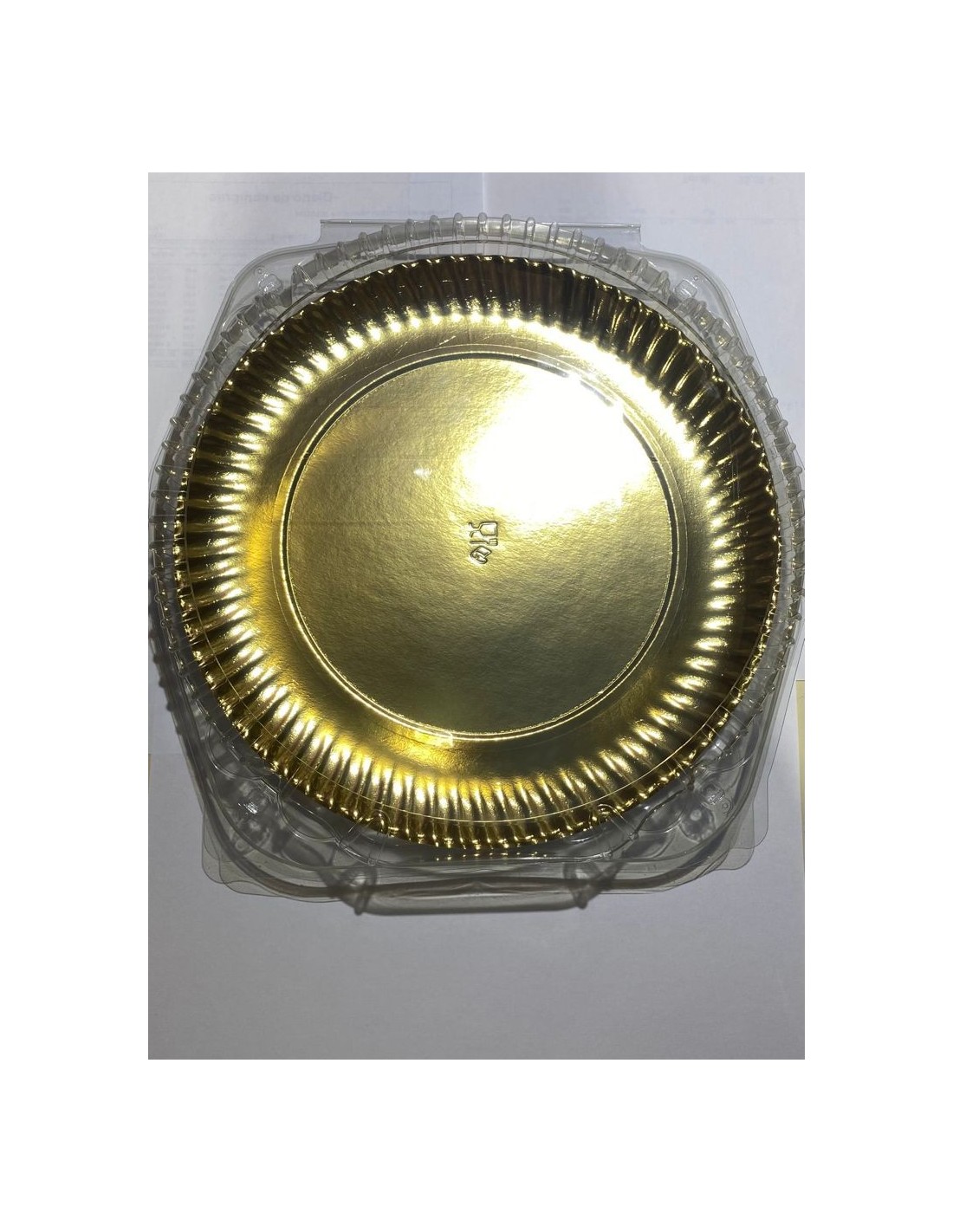 Recipiente plástico con plato dorado, perfecto para tartas y pasteles.